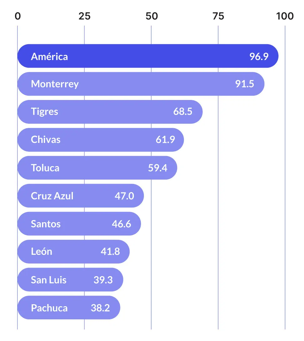 en día, esa apuesta vaya que valió la pena. Además de ser el máximo ganador de la Liga MX, el “Ame” cuenta con más de 30 millones de aficionados en México y más de 10 millones en Estados Unidos, según un estudio de The Nielsen Company en 2019. Sus partidos por lo general cuentan con una audiencia promedio de 8.1 millones de espectadores por partido, cifra mayor que sus competidores más cercanos en ambos países.