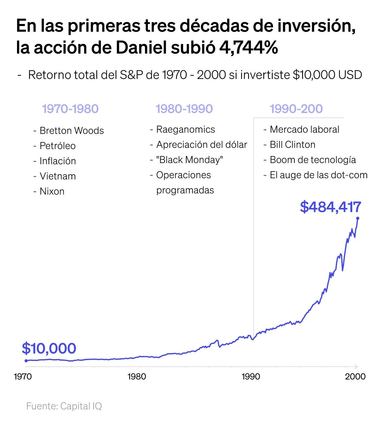 Para 1970, Daniel tenía 20 años y $10,000 ahorrados, una suma considerable para alguien de su edad. Su papá le sugirió que invirtiera ese dinero en el mercado de valores, específicamente en el S&P 500, que había mostrado un crecimiento constante durante las décadas anteriores. Daniel, motivado por su ambición y por la confianza en el crecimiento económico de Estados Unidos, decidió dar el paso.