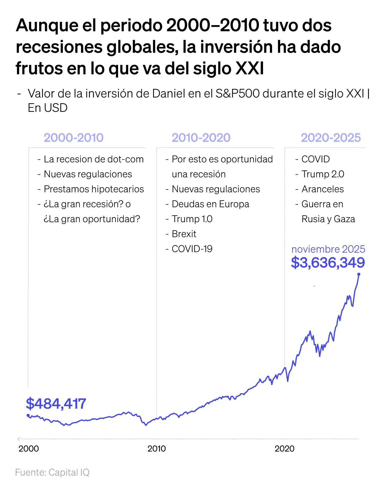 Para muchos, los 2000 fueron una década de oportunidades disfrazadas de crisis. Entre marzo de 2000 y octubre de 2002, el Nasdaq cayó 77%, borrando las ganancias de la burbuja dot-com. Cientos de empresas tecnológicas quebraron, y la confianza se desvaneció. Sin embargo, Daniel mantuvo su inversión. Para 2007, el S&P 500 ya estaba 27% arriba de su nivel del año 2000. Su portafolio creció 108% desde el fondo de la crisis hasta ese pico.