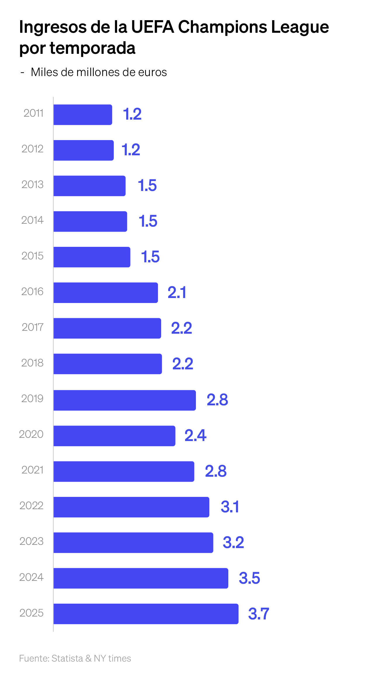 En una carta de la UEFA referente a la temporada 24-25, la proyección de ingresos utilizada para calcular la distribución entre los equipos contempla un total superior a$3,700 millones de euros, provenientes de patrocinios, licencias y comercialización, regalías, venta de boletos en la final, y los derechos de retransmisión. Esta última representa casi el 70% de los ingresos totales del torneo. Plataformas como HBO Max y Caliente TV han comenzado a competir con televisiones tradicionales, peleando por los derechos exclusivos, lo que ha elevado el valor de mercado a través de un modelo de subasta.