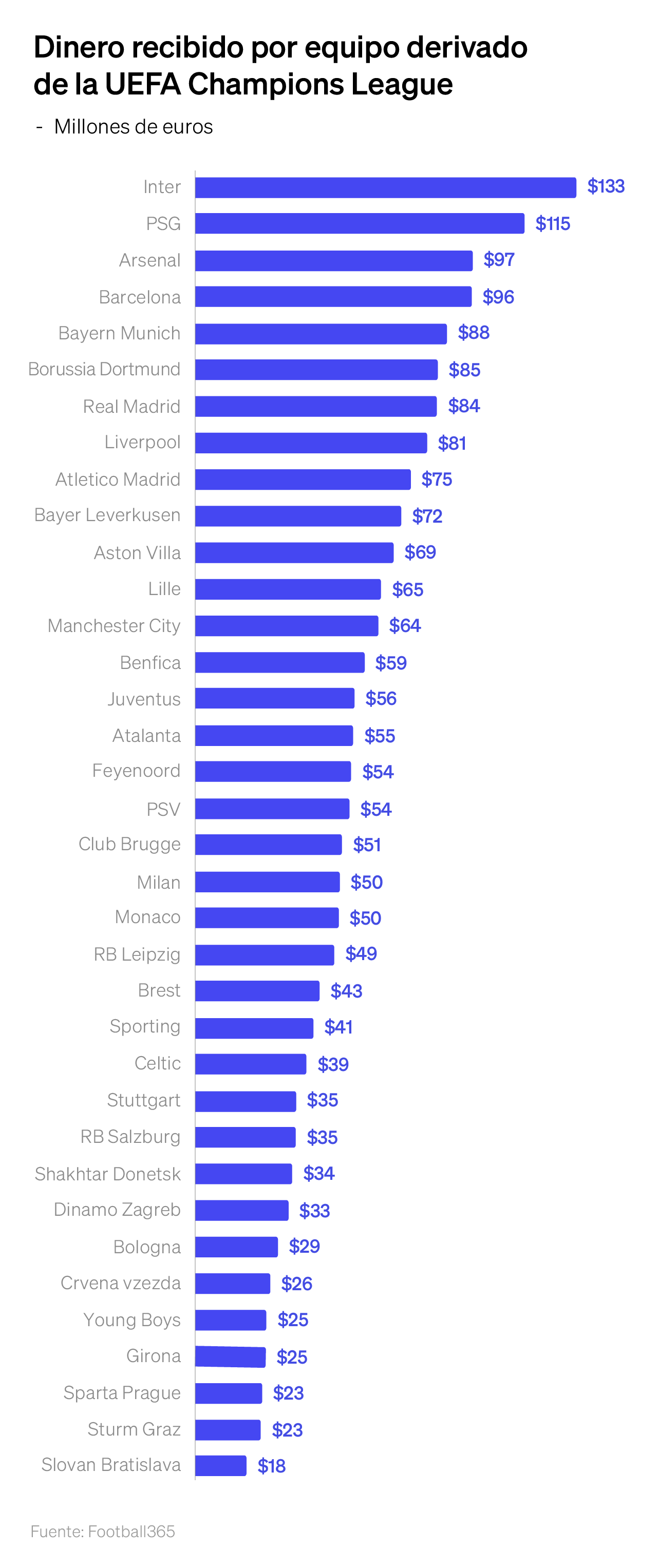 Para los clubes, participar en la UEFA Champions League es una prioridad deportiva y sobre todo, financiera. Cada club que participó en la fase de liga de esta temporada recibió al menos €15.6 millones de euros. A esto se suman bonificaciones por victoria (€2.8 millones), clasificación y reparto del market pool. Un campeón puede acumular más de €100 millones por su participación. De hecho, según estimaciones del periódico Gazzetta dello Sport, el Inter de Milán ya ha recibido $133 millones de euros esta temporada, y de ganar la final podría recibir $10.5 millones de euros adicionales, convirtiéndose en la temporada más rentable en la historia del club, esto sin considerar la venta de tickets en los partidos de local durante el campeonato, que según la misma fuente, ascienden a más de $60 millones de euros.
