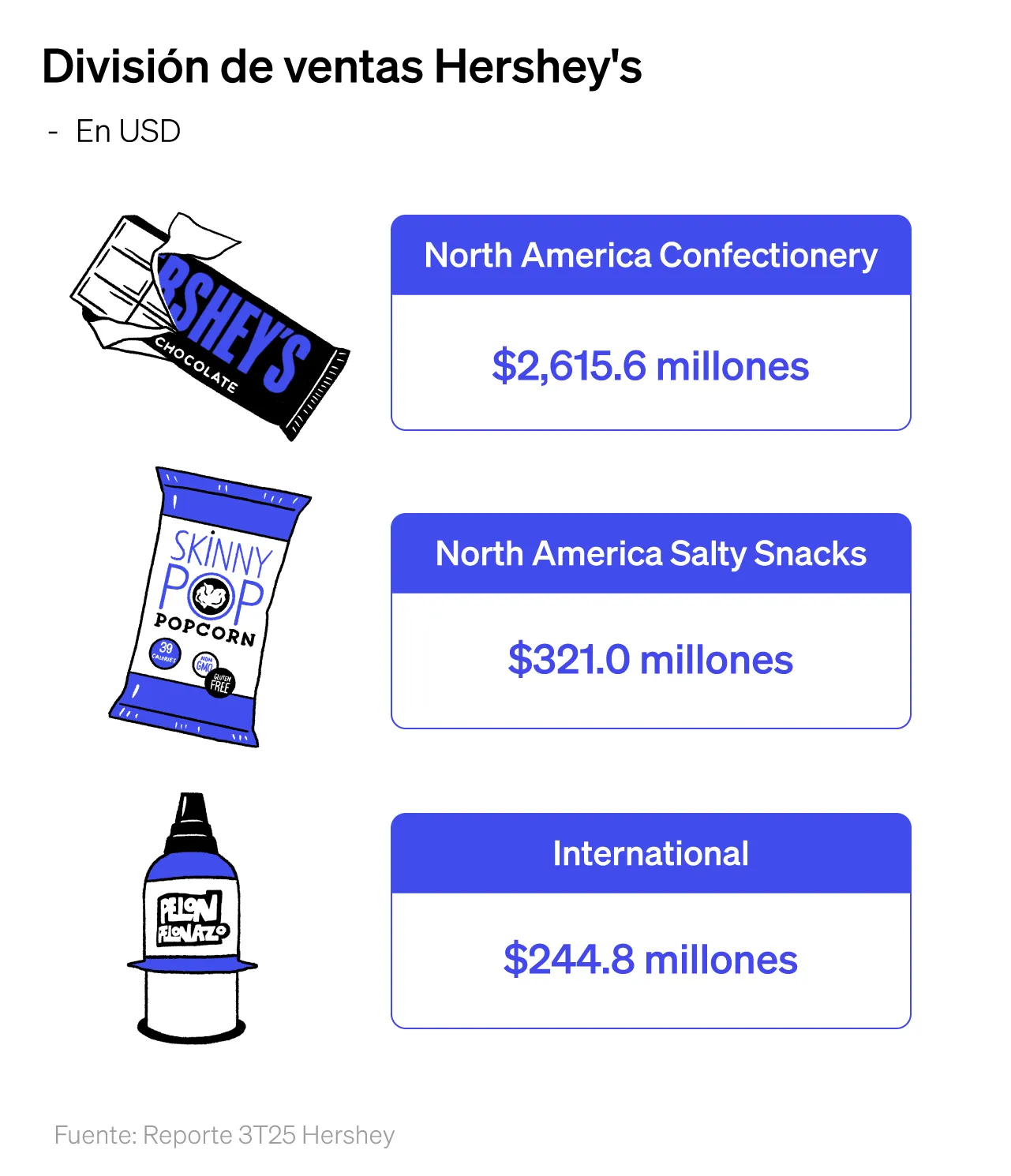 Esa estructura permitió a Hershey’s crecer y consolidarse como uno de los jugadores dominantes del mercado estadounidense de confitería. Hoy, la empresa genera más de $3,100 millones de dólares en ventas al trimestre, con un crecimiento anual cercano al 6.5%, impulsado principalmente por aumentos de precio y fortaleza de marca particularmente en Norteamérica. El negocio central de confitería sigue siendo altamente rentable, pero opera en una industria cada vez más presionada por el costo del cacao, la energía y las tarifas. En el mismo periodo, el margen bruto se redujo de más del 41% a cerca del 33%, y la utilidad neta cayó 38%, esto reflejó la sensibilidad del modelo a cambios en los insumos y costos de operación.