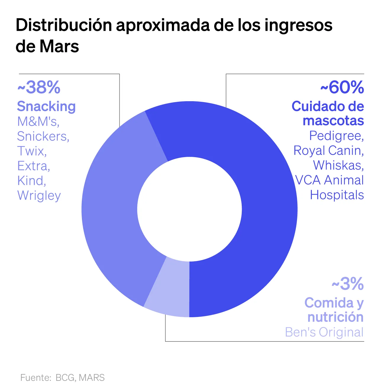 Con el tiempo, el chocolate se convirtió en uno de varios pilares. Mars utilizó los flujos de su negocio original para expandirse hacia alimentos y, luego, hacia el cuidado de mascotas. El segmento de petcare creció hasta convertirse en uno de los más importantes del grupo, con marcas globales y una demanda mucho más estable que la confitería. Esa diversificación redujo la dependencia del cacao, equilibró la volatilidad entre negocios y reforzó la capacidad del grupo para sostener márgenes a lo largo de distintos ciclos económicos.