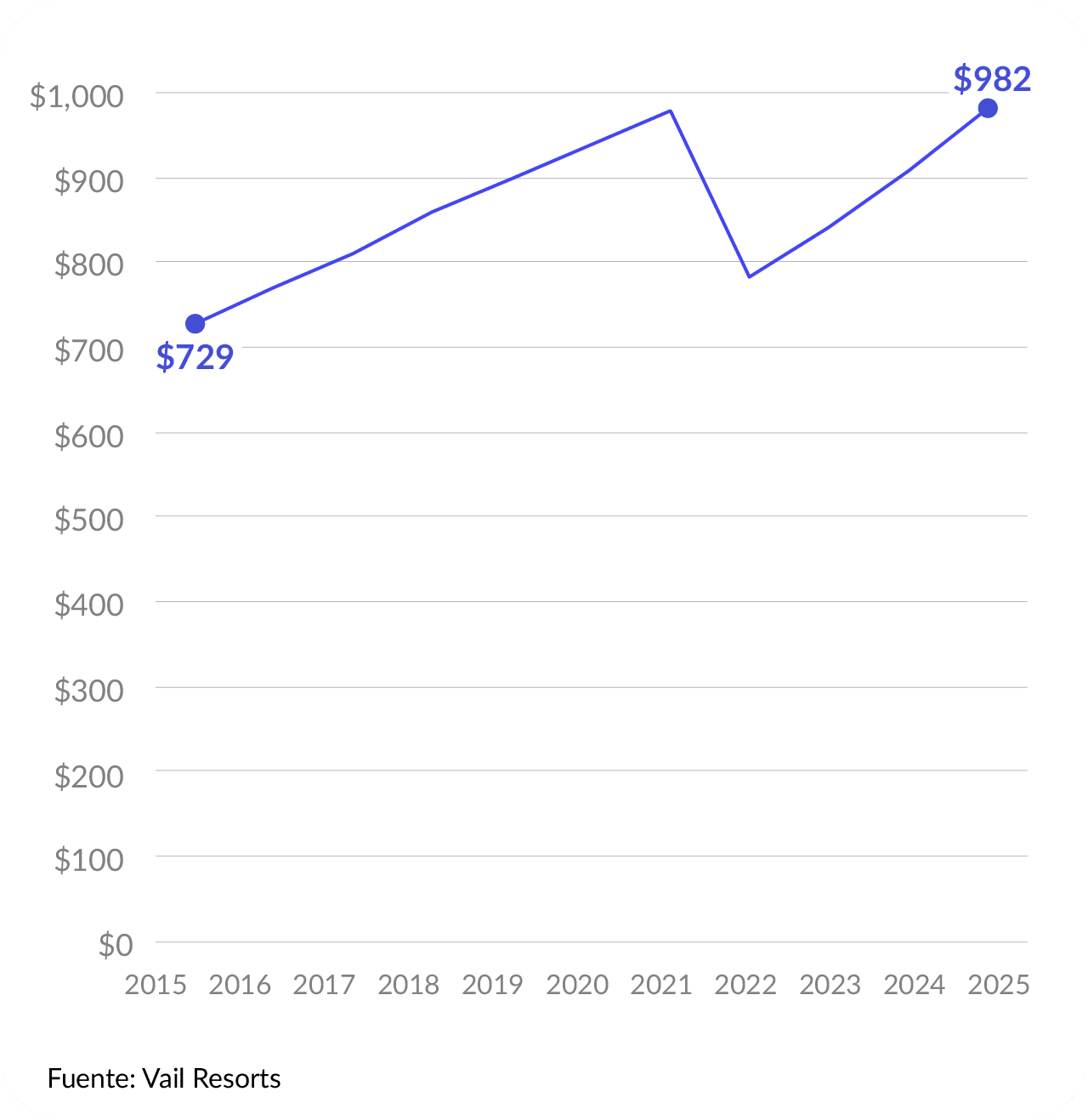 El Epic Pass representa más del 65% de los ingresos por acceso a teleféricos, demostrando su relevancia como estrategia de fidelización y mitigación de riesgos en temporadas de baja nieve. Además, genera ingresos anticipados que cubren hasta el 50% de los costos operativos anuales de Vail Resorts.