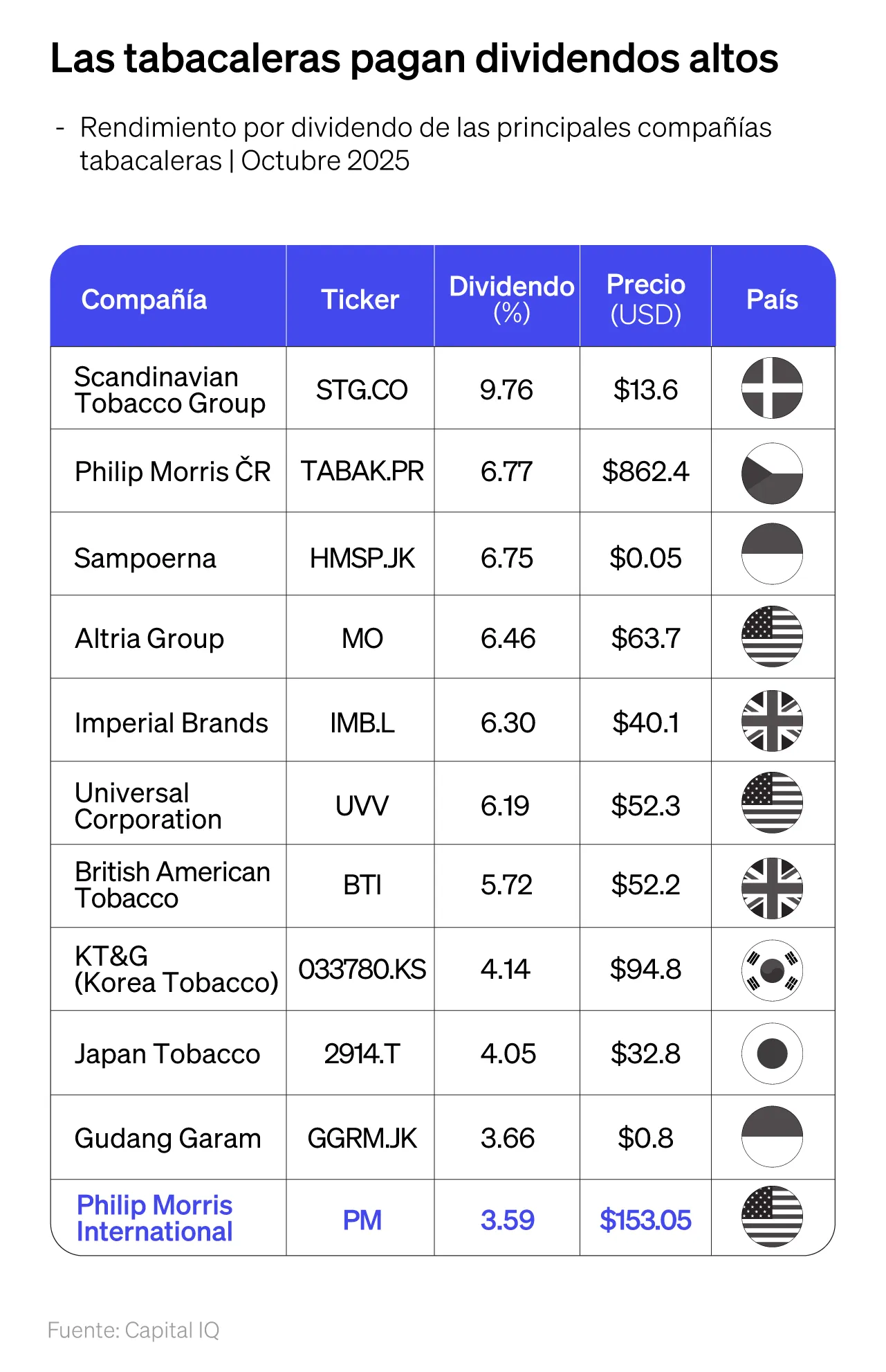 Philip Morris International (PM) genera más de $10,000 millones de dólares en flujo libre anual, con márgenes operativos por encima del 40% y un dividendo de casi 5%, lo que la mantiene como una acción defensiva clave en portafolios de ingresos estables.