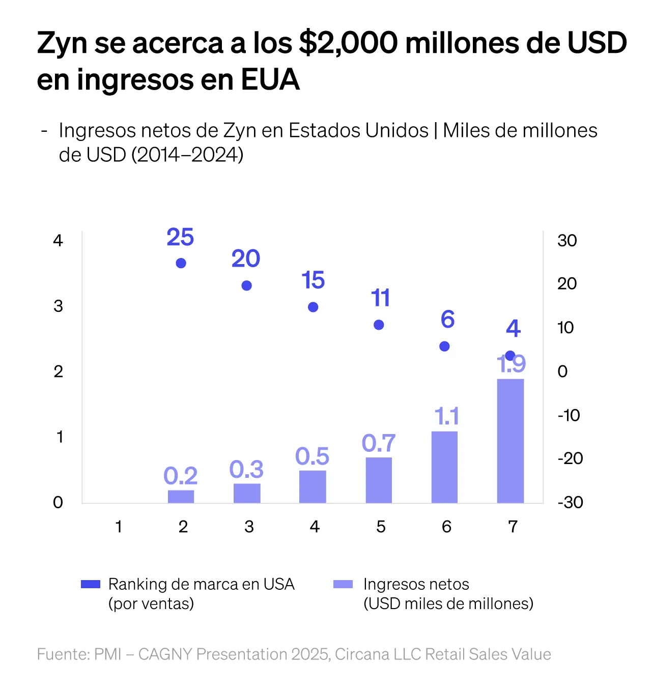 Las ventas de Zyn crecieron 38% interanual, alcanzando 205 millones de latas en el último trimestre, y ya representan el 41% de los ingresos sin humo de Philip Morris (PM). Para los inversionistas, esto implica exposición a un segmento de alto crecimiento dentro de una industria tradicionalmente madura