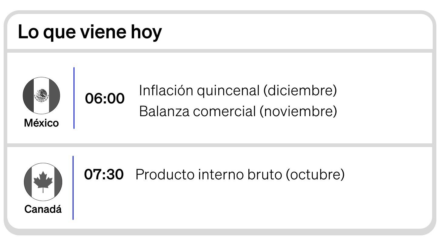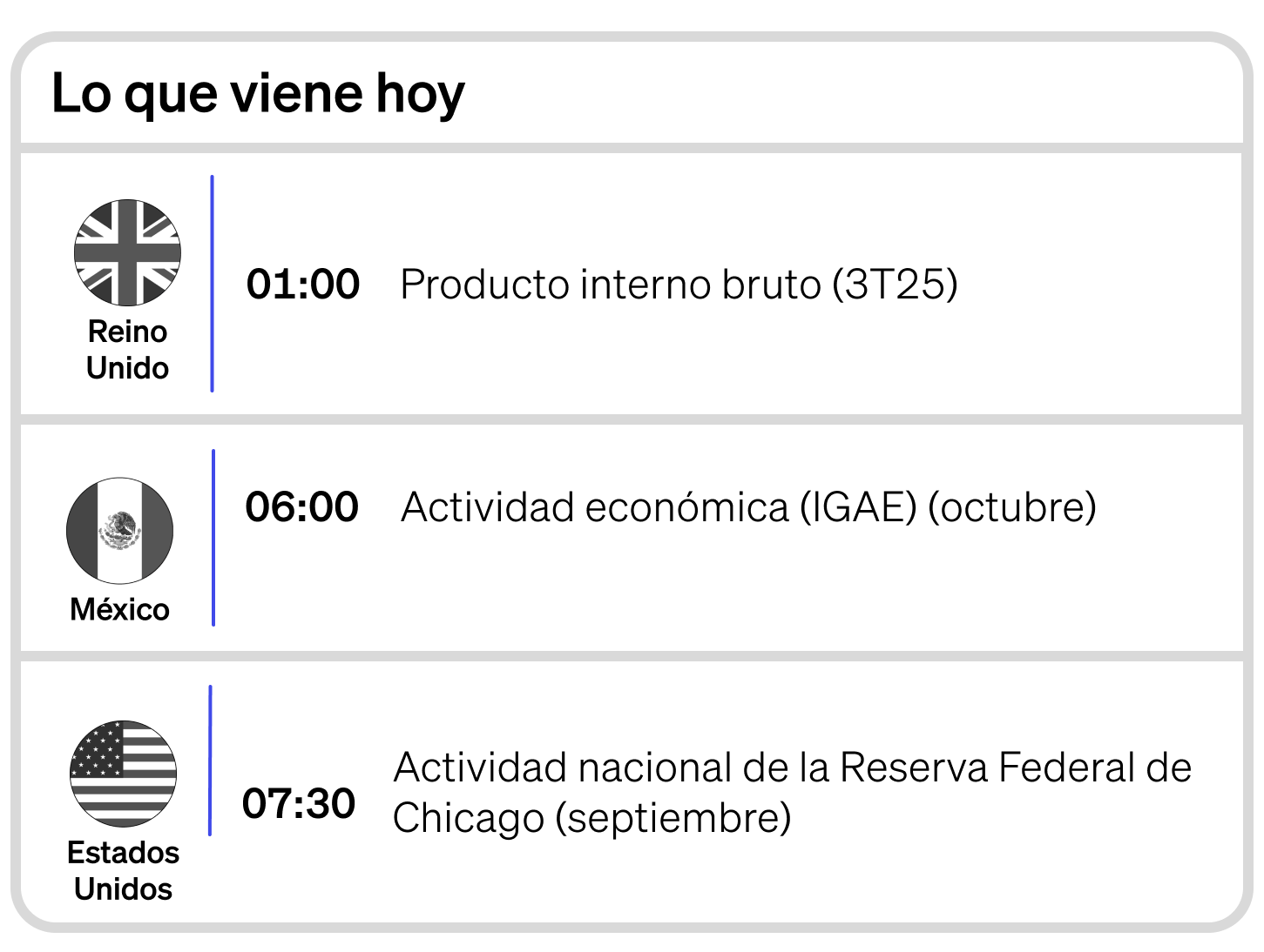 Los participantes del mercado también estarán atentos al índice global de actividad económica (IGAE) de octubre, que se publica hoy, después de que cifras sólidas de producción industrial mostraron señales positivas al inicio del trimestre. Además del dato de inflación, el martes también se divulgarán la balanza comercial de noviembre, y la actualización semanal de las reservas internacionales. Por último, la tasa de desempleo se dará a conocer el miércoles, y los mercados cerrarán temprano este día y permanecerán cerrados el jueves, por la celebración de Navidad.
