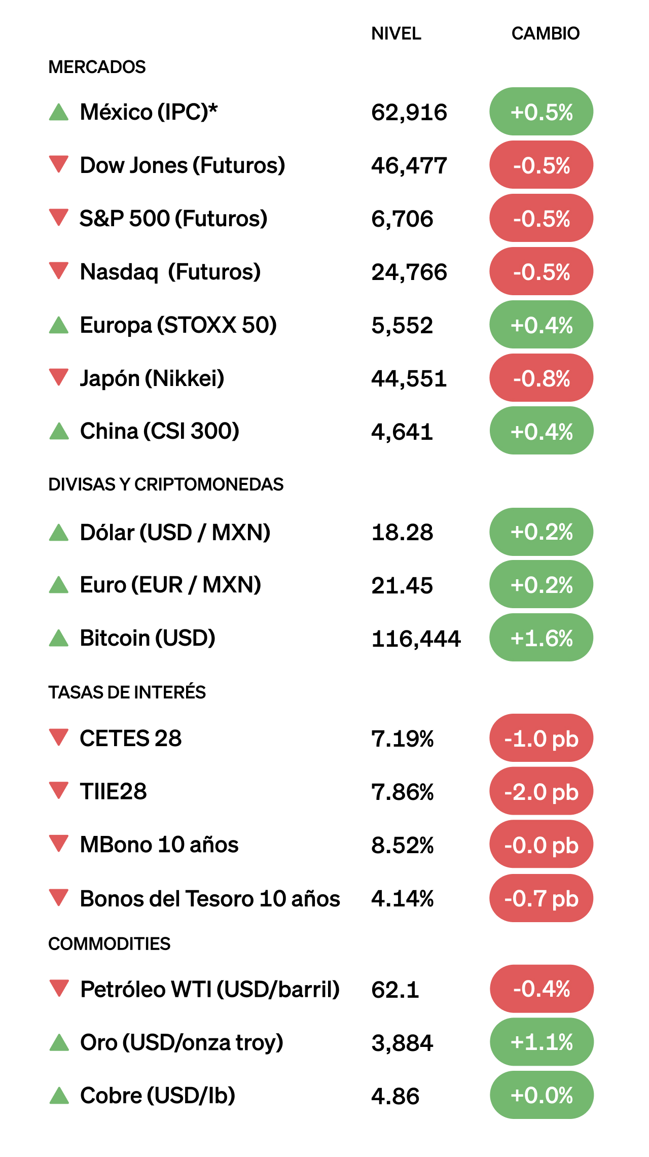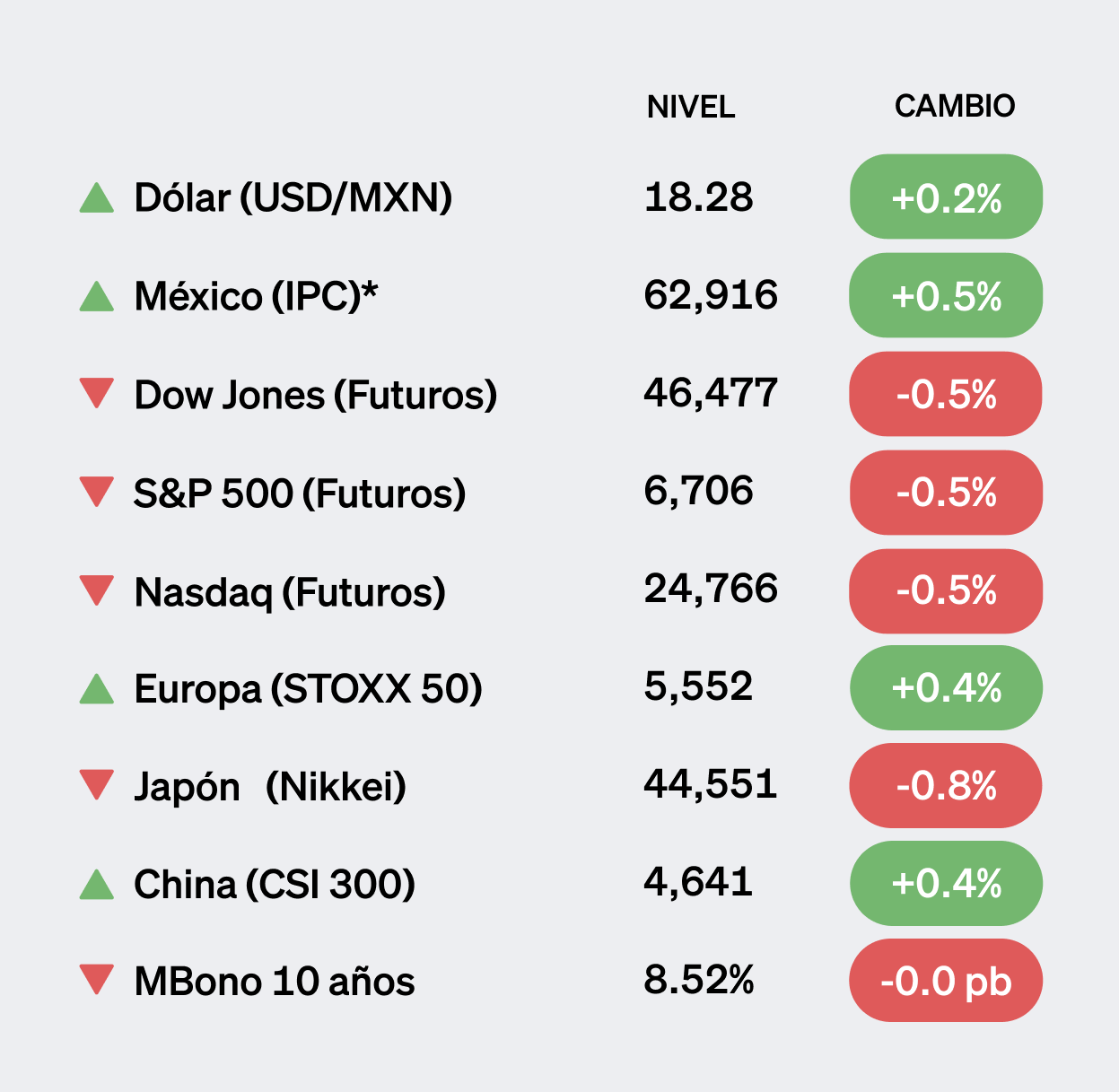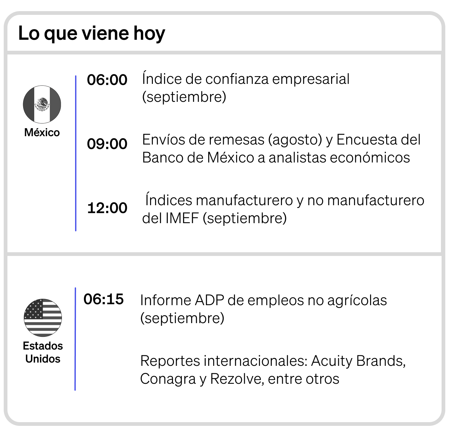 Los futuros inician octubre en rojo tras el primer cierre de gobierno en Estados Unidos en casi siete años, detonando aversión al riesgo. El dólar liga cuatro días a la baja, mientras el oro ronda los 3,900 dólares por la onza, en tanto que la plata y el cobre también se benefician de la debilidad cambiaria. El cierre amenaza con frenar la publicación de datos clave, como las solicitudes de subsidio por desempleo y la creación de empleo de septiembre, dejando a los mercados sin claridad sobre la política monetaria. En este contexto, el informe ADP de empleo privado, que se emitirá hoy, cobra mayor relevancia. Además, entran en vigor los aranceles anunciados por Trump en Truth Social a sectores como farmacéutica, camiones pesados y muebles, aunque sin mayores detalles sobre su implementación.