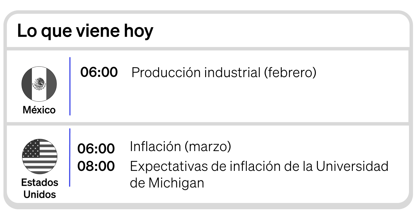Los futuros en Wall Street operan prácticamente sin cambios en la última sesión de la semana, mientras los inversionistas esperan el dato de inflación de marzo en Estados Unidos, clave para las expectativas de tasas. La atención también se centra en las conversaciones entre Washington e Irán en Islamabad, donde el mercado percibe un tono ligeramente optimista hacia una posible desescalada, aunque persisten las tensiones. En tanto, continúan las disrupciones en la oferta global: el tráfico comercial por el estrecho de Ormuz se mantiene casi detenido y Arabia Saudita reportó afectaciones en su capacidad petrolera tras ataques recientes, lo que mantiene al crudo en el foco. Por otro lado, TSMC reportó un sólido crecimiento de 35% en ingresos trimestrales, reforzando la narrativa de una demanda firme en inteligencia artificial.