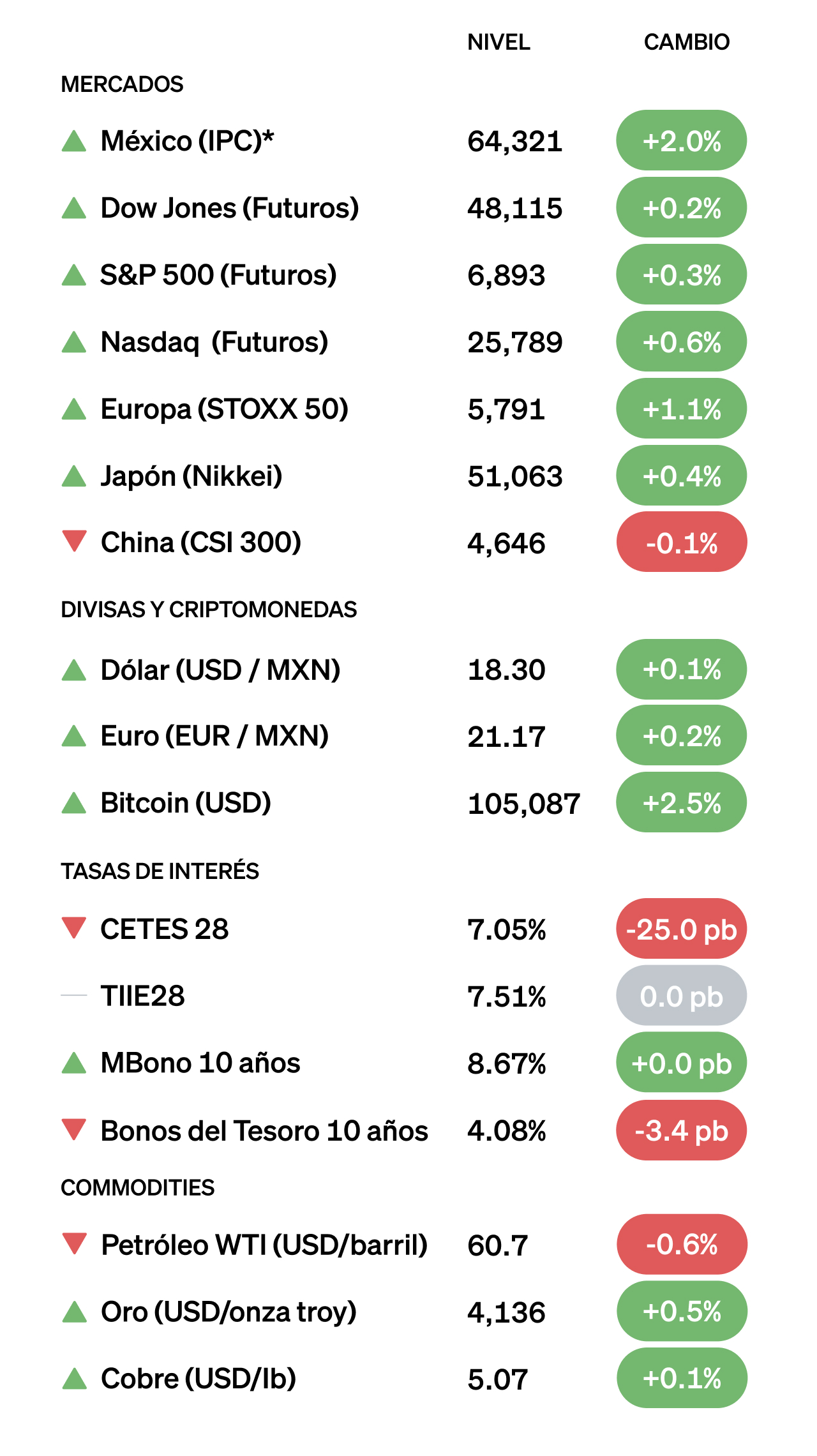 Lo más importante: Cámara votará hoy acuerdo para reabrir el gobierno; AMD proyecta triplicar ingresos por chips de IA; Nebius y Meta sellan alianza; Microsoft invertirá en centro de IA en Portugal. En México, Heath alerta por salarios e inflación; Ebrard reporta avance del T-MEC; México eleva aranceles al azúcar. |