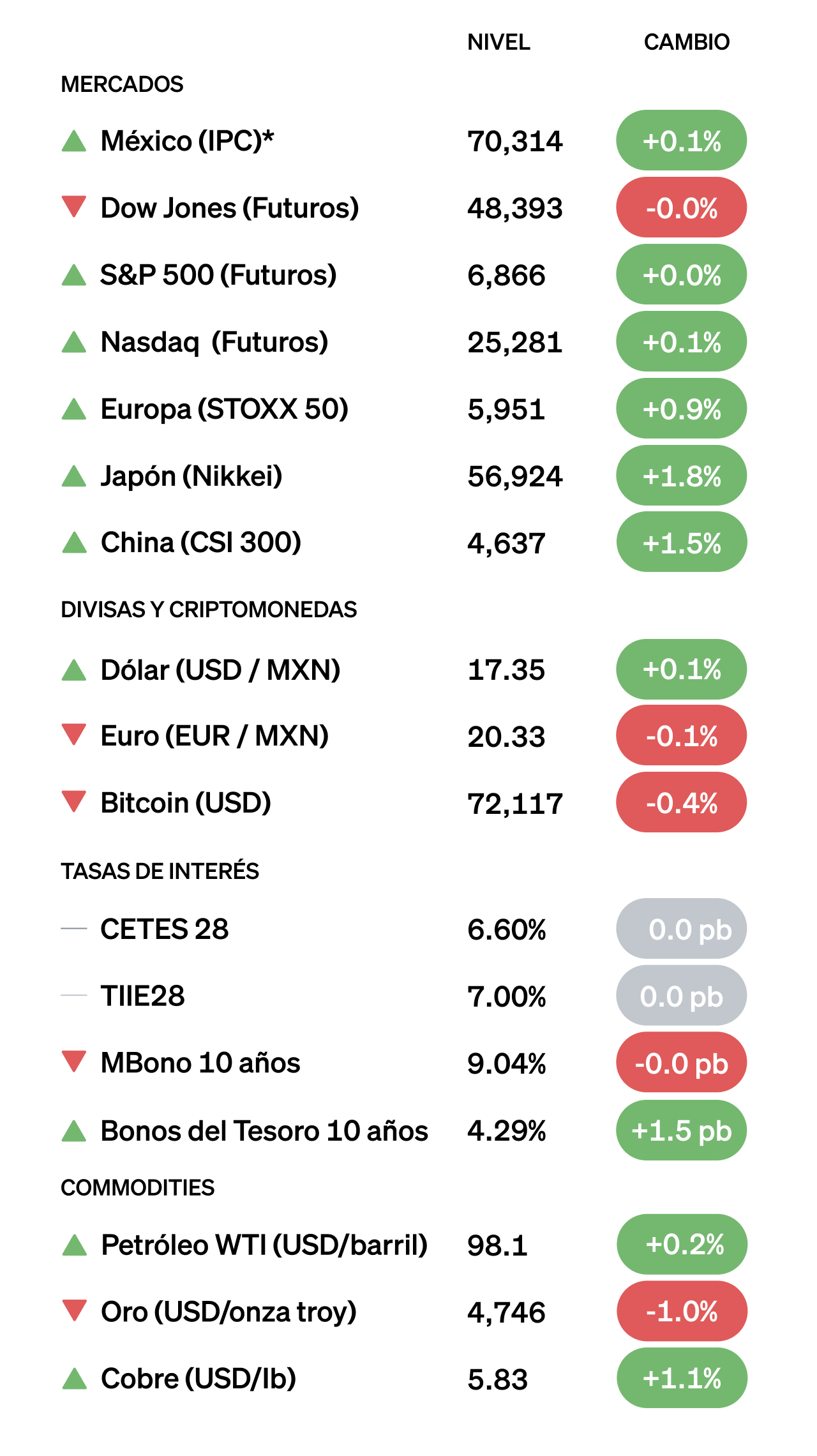 Lo más importante: Foco en inflación, Ormuz y negociaciones en Islamabad; TSMC refuerza narrativa de IA; Meta establece acuerdo con CoreWeave; Amazon impulsa streaming. En México, Banxico se muestra dividido; Constellation Brands anuncia inicio de planta; fintechs avanzan a rentabilidad. |