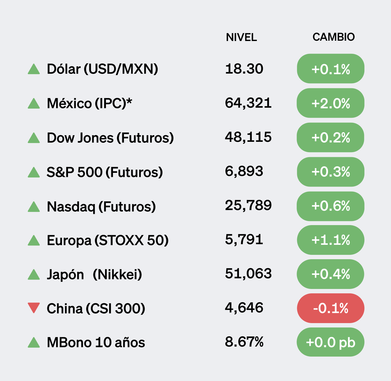 Los futuros de Wall Street avanzan, impulsados por el optimismo de que el cierre del gobierno estadounidense podría llegar pronto a su fin y por las crecientes apuestas sobre un recorte de tasas por parte de la Reserva Federal el próximo mes. El sector tecnológico encabeza las ganancias, respaldado por el renovado entusiasmo en torno a la inteligencia artificial. Advanced Micro Devices proyectó un crecimiento acelerado en los próximos cinco años gracias a la fuerte demanda de sus productos para centros de datos, mientras que Hon Hai Precision, socio de Nvidia, también ofreció una perspectiva positiva.