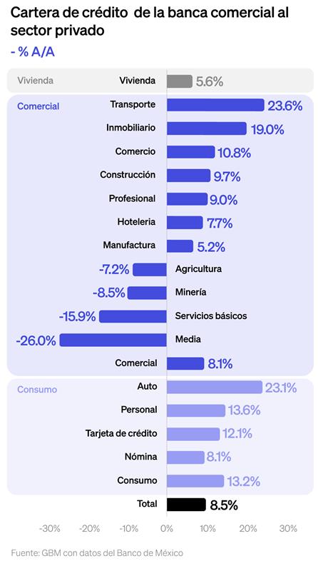 Seguimos observando una desaceleración en la expansión de la cartera de crédito de bancos comerciales en agosto, que registró incluso su menor avance mensual después de la pandemia a causa de una disminución en la cartera comercial. Por sector, el mayor dinamismo en los créditos al consumo se observó en el segmento automotriz (+23.1% anual), en tanto que los créditos comerciales mostraron resultados mixtos por segmento, donde la categoría de transporte se expandió 23.6% anual, mientras que medios se contrajo en 26% anual.