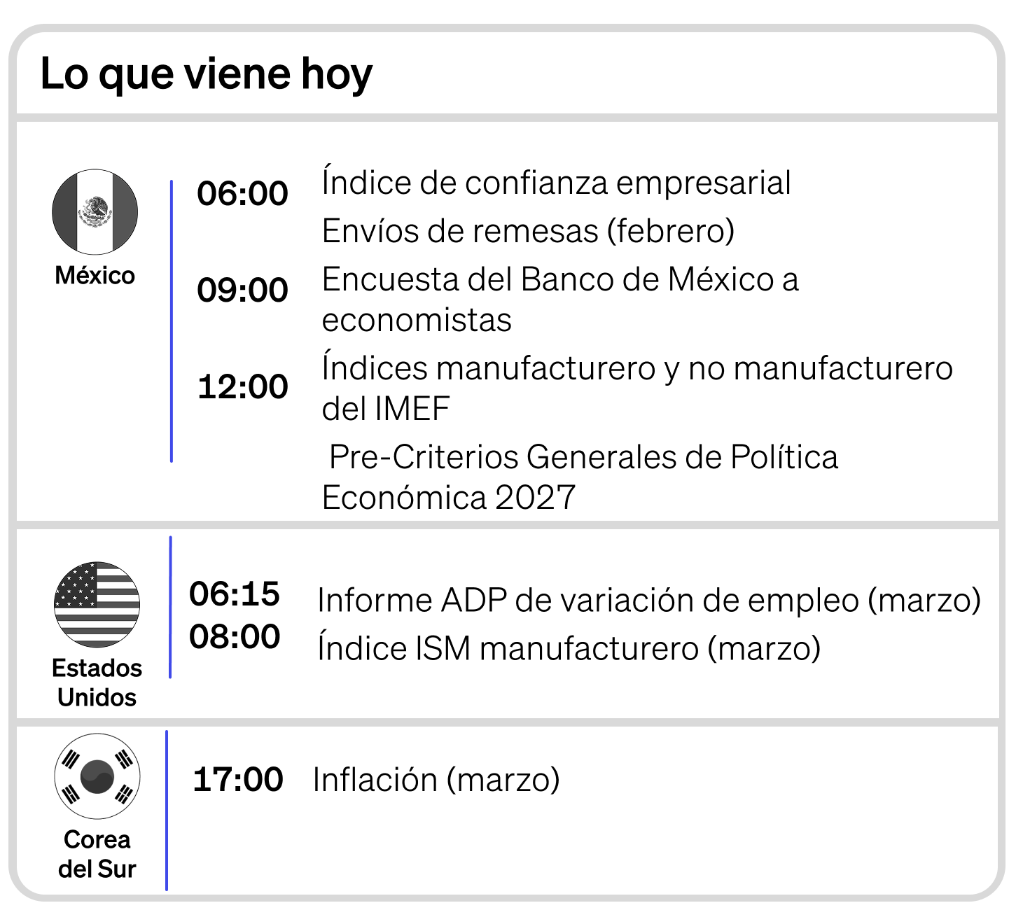 La Secretaría de Hacienda y Crédito Público (SHCP) publicará hoy los Pre-Criterios Generales de Política Económica 2027, un documento que el mercado seguirá de cerca, ya que incluye los objetivos fiscales y la proyección preliminar del presupuesto para 2027. Asimismo, se espera una actualización de los pronósticos macroeconómicos de Hacienda para este año y el próximo. Los participantes del mercado estarán muy atentos a las previsiones sobre el precio del crudo y la producción estimada debido al contexto geopolítico en Medio Oriente y su impacto en los precios del petróleo.