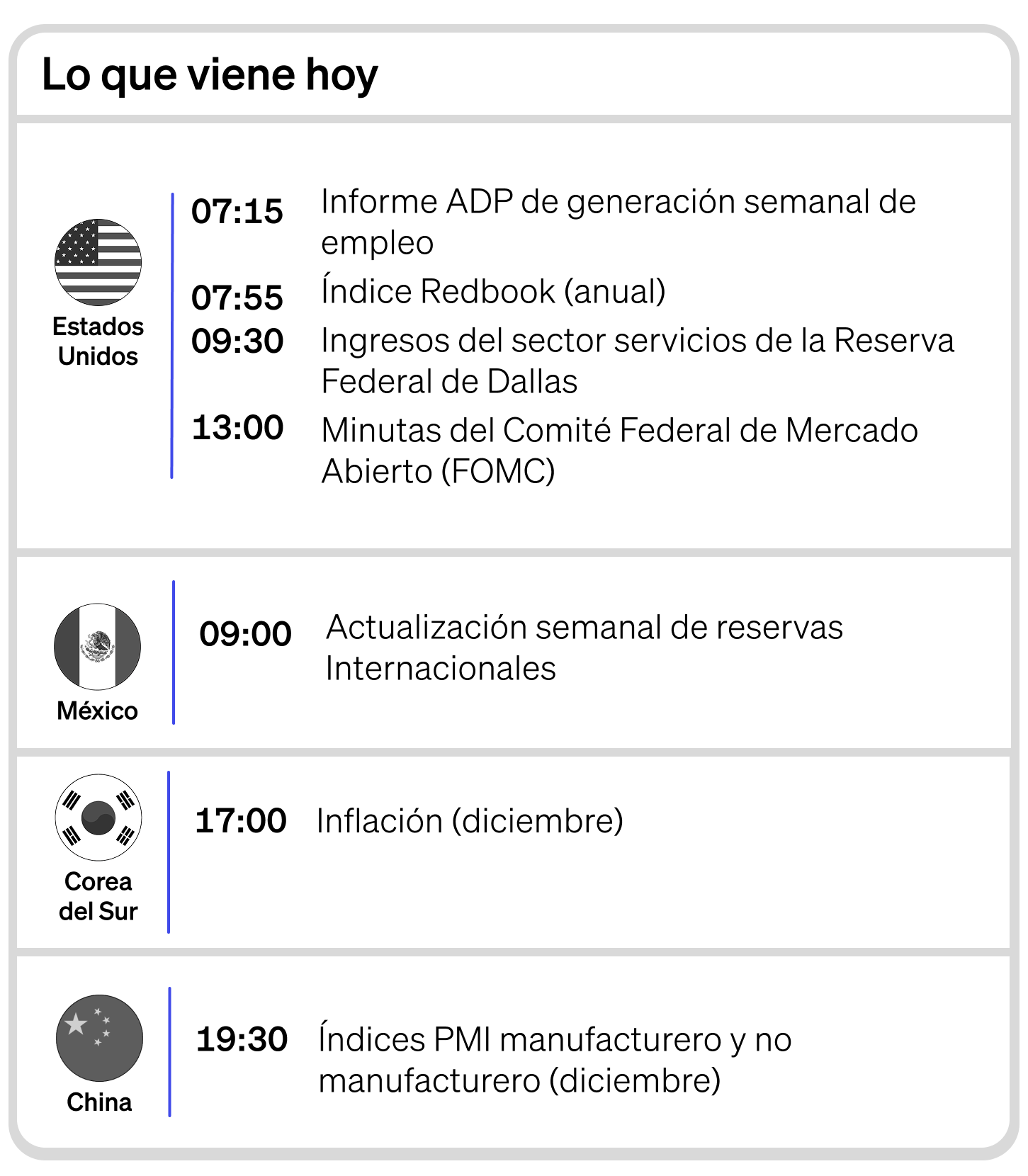 Los futuros de Wall Street abren la segunda jornada de la semana con ligeras caídas, tras una sesión previa negativa marcada por la presión del sector tecnológico. Entre las emisoras más afectadas destacaron Palantir Technologies, Oracle y Nvidia. Por su parte, la atención de los mercados se centra hoy en la publicación de las minutas de la decisión de diciembre de la Reserva Federal, en busca de mayor claridad sobre cómo evalúa el banco central la trayectoria de la política monetaria de cara a 2026. Se trata de la última publicación económica clave de 2025, en una semana corta en la que los mercados permanecerán cerrados el jueves por el feriado de Año Nuevo.